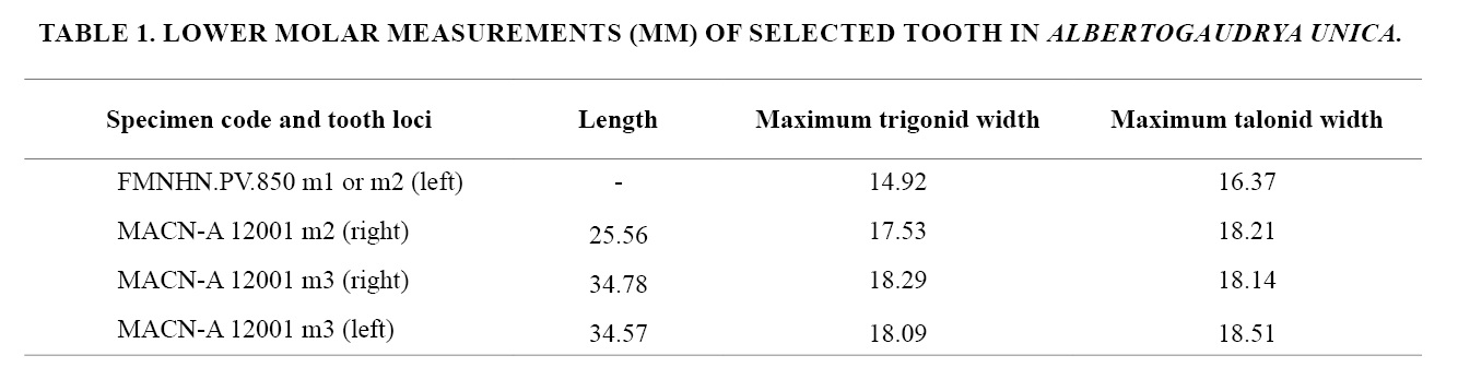 Dental elements usually form the bulk of the mammalian fossil record, and astrapotheres are not the exception. Nevertheless, lower molars of Albertogaudrya unica are certainly infrequent, and inadequately published or figured in the past scientific literature. The detailed description of FMHN.PV.850 allows a preliminary analysis of the variability observed in the other, few well-preserved lower molariforms assigned to this genus, which includes a handful of isolated teeth, and a pair of more complete and associated premolar-molar series (Simpson, 1967a; Appendix).